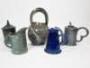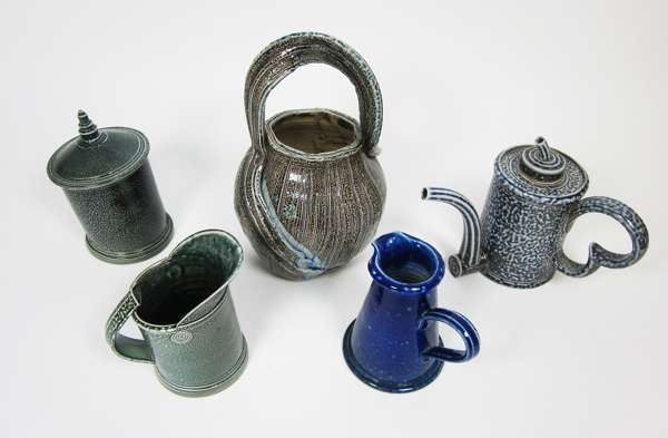 impressed maker's mark, 17cm high; a WALTER KEELER JUG, impressed maker's mark, 13cm high; DR PETER MEANLEY (B. 1944) SALTGLAZED TEAPOT, impressed seal mark, 17cm high; a DANIEL BOYLE JUG, 12.5cm high and a JOHN BRADLEY SALTGLAZED SINGLE HANDLED BASKET, impressed seal mark, 26cm high (5)