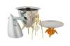 comprising a 'HOT BERTAA' KETTLE, 25cm high; a gold finish 'JUICY SALIF' LEMON SQUEEZER, 29cm high; a 'MAK LE CHINOIS' COLANDER & LINER, 30cm high, each with stamped maker's marks, the squeezer and kettle with original labels; also a chrome plated and plastic FOOTED TAZZA, 29cm across (4)