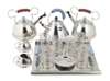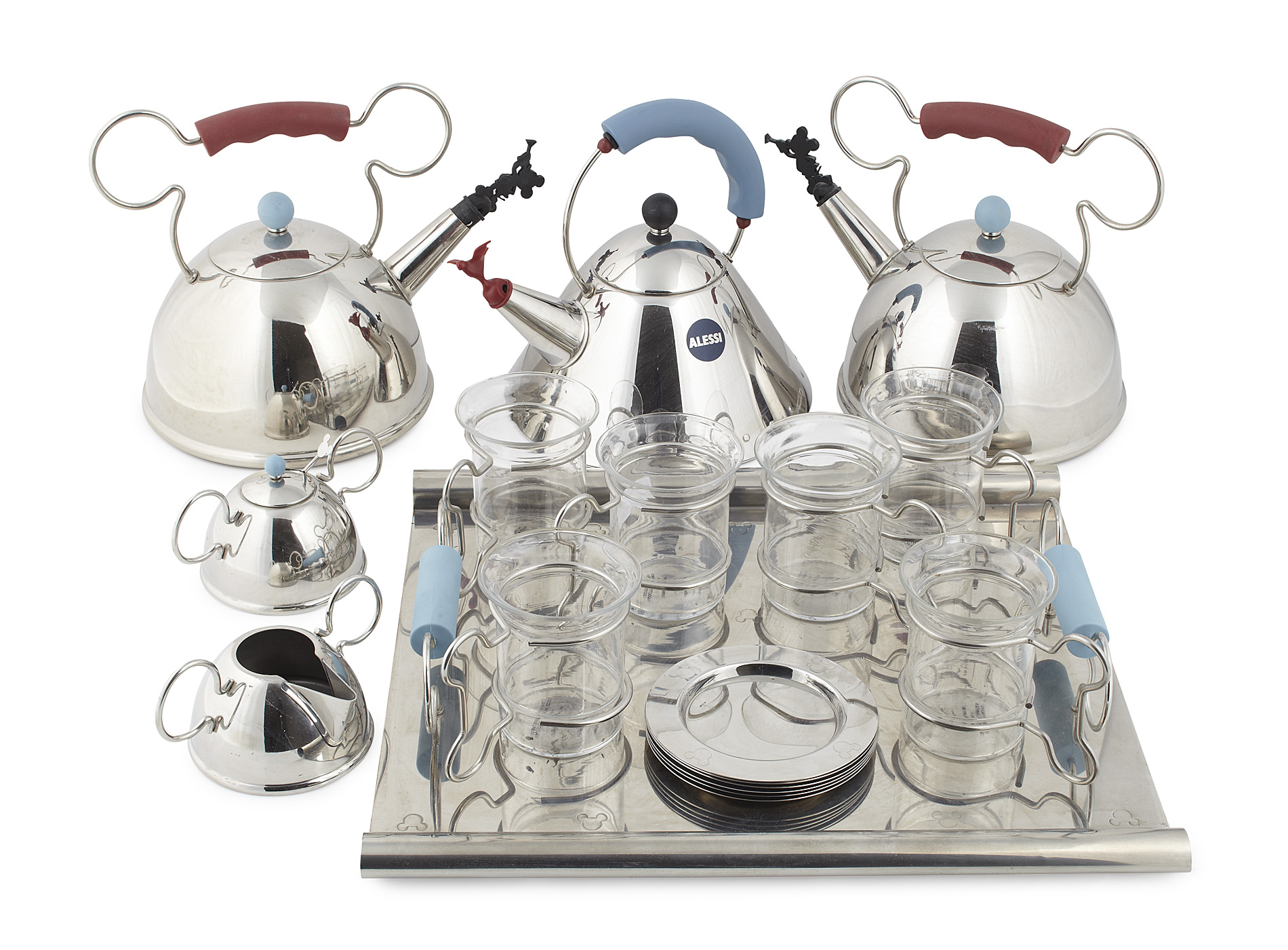 comprising a CHROMIUM KETTLE, with bird whistle, 24cm high; TWO 'MICKEY MOUSE' KETTLES, each with mouse whistles, 23cm high; a SET OF SIX GLASS & CHROME 'MICKEY MOUSE' TEA CUPS & HOLDERS; MATCHING TRAY, SUGAR BOWL, SIX PLATES AND A CREAMER, tray 38cm across (18)