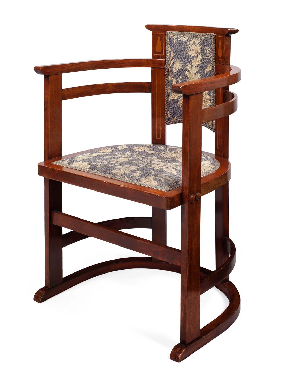 the inlaid back with upholstered panel above curved arms and upholstered seat on tapered supports linked by stretchers