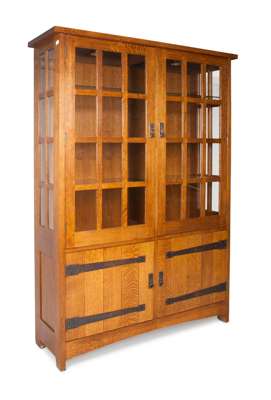 the projecting corners above two astragal glazed doors and tongue and groove doors below with decorative hinges, branded maker's mark