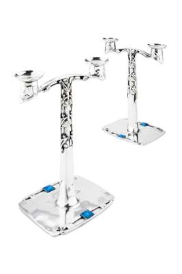 each twin-branch with removable sconces supported on columns with openwork leaves and berries, the pierced base embellished with variegated blue enamelled leaves, stamped TUDRIC and TUDRIC PEWTER 0530 (2)