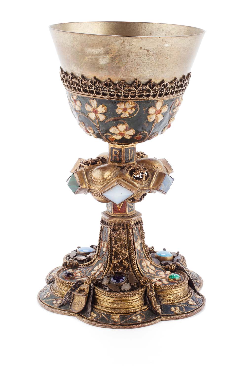set with semi-precious cabochon and diamond cut stones, with applied wirework, enamelled flowers and cast and pierced decoration depicting angels and foliage, the knopped stem on lobed spreading foot