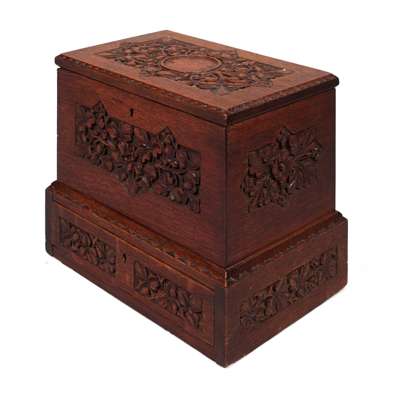 carved with foliate panels, the hinged lid with dentil frieze above base with corresponding frieze and single drawer