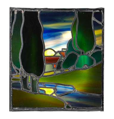 STAINED & LEADED GLASS LANDSCAPE PANEL, CIRCA 1910