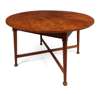 circular top above turned and tapering legs linked by a cross stretcher and terminating in pad feet