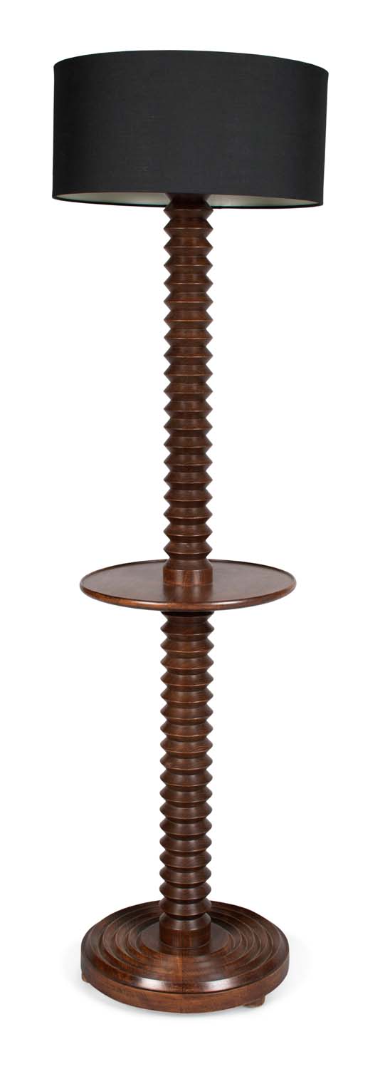 turned 'serrated' column with circular shelf spacer on fluted circular base, black cylindrical shade