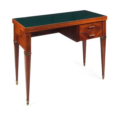 en suite to the previous lot, the rectangular top with green glass inset above two asymmetric drawers on square tapering legs with brass caps