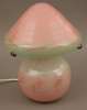 the domed mushroom shade above an ovoid base, both with mottled pink bodies and bands of swirls joining a green rim