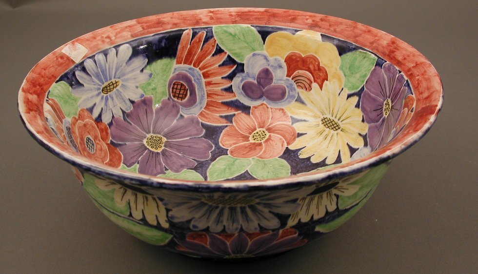 the circular body with everted rim, painted in bright pattern with an allover design of leaves and flowers, painted mark
