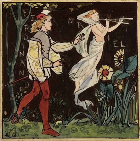 printed and painted in coloured enamels with the figures of Ferdinard and Ariel, in a floral landscape, impressed marks verso
