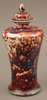 the shouldered vase with mottled red and purple pitted glaze on a white ground, impressed mark (restored area to shoulder)