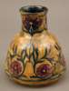 of tapering ovoid form with cylindrical neck and everted rim, painted in shades of green and purple with all over flowering stems on a mottled olive ground, printed mark, signed 'Geo. Cartlidge c.63.5'
