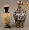 of baluster form with silver mount, incised and applied with bands of flowerheads and foliage and painted in colours, impressed and incised marks, 29cm high, and a Royal Doulton stoneware baluster vase, with impressed floral decoration