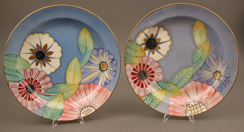 each painted in gilt and coloured enamels with floral and foliate sprays on a mottled blue ground, printed and painted marks,