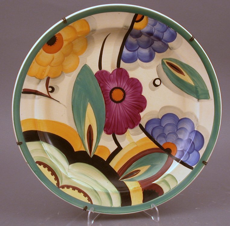 of dished form painted in bright colours with stylised flowers and leaves, printed and painted marks 9303