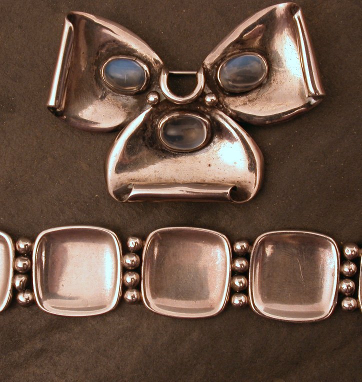worked as three scrolls set with moonstones, 6cm across, a Danish sterling bracelet worked as concave squares linked by beaded hinges, 20cm long and a collection of Norwegian sterling and enamel jewellery (a lot)