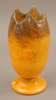 of swollen cylindrical form with pulled rim, the mottled orange and yellow body with amethyst inclusions to the rim, etched mark with applied paper label