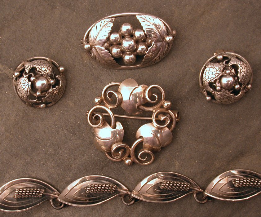 of circular outline worked as scrolling leaves, 3cm across, a Danish sterling brooch of oval form with leaf and berry design, 3cm across, a Danish sterling bracelet worket as linked lily flowers, 22cm long and a pair of danish sterling earrings of circular form worked as a frieze of swimming fish, 1.5cm across (5)