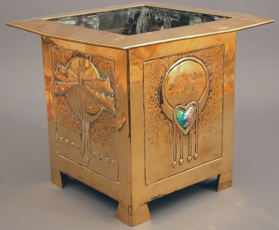 of square section, the broad rim above opposing panels repousse decorated with polychrome enamel hearts within a totem on a beaten ground, and opposed panels of stylised dragonfly on a similar ground, the whole raised on bracket feet