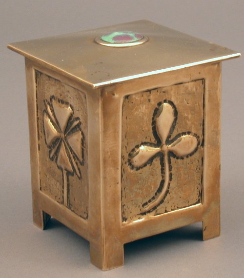 the square hinged lid set with a Ruskin roundel, above sides with repousse panels of clover leaves and flower heads on square bracket feet