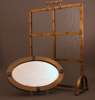 of rectangular form, formed as a lattice of beaten and rivetted straps enclosing panels of frosted glass, also an oval brass mirror, the bevelled plate enclosed by a beaten frame set with four Ruskin roundels, retailed by Liberty & Co. (2)