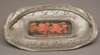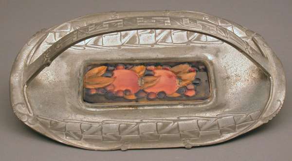 designed by Archibald Knox, the oval tray cast with stylised fruiting branches and centred by a Moorcroft panel, painted in the pomegranate pattern, the applied handle similarly cast with stylised leaves and berries, stamped mark 0357