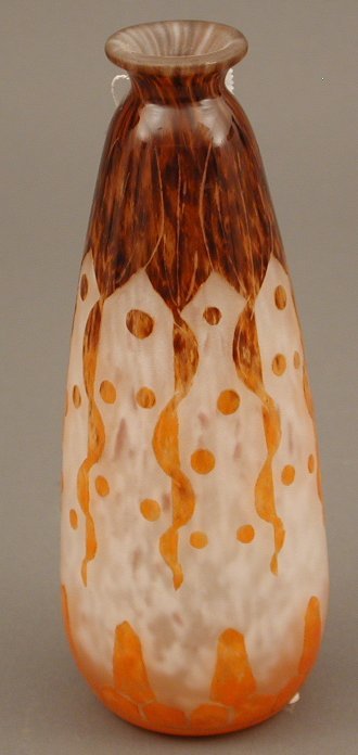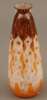 of tapering and swollen cylindrical form with everted rim, the clear glass with mottled white inclusions, overlaid with mottled orange and brown glass and acid etched with vertical wave and dot motifs, etched mark