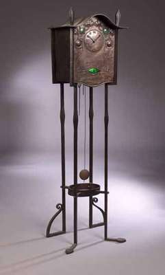 the single train movement with arched rectangular copper dial, repousse decorated with stylised flowerheads and seed pods with whiplash foliage, enclosing a circular dial and set with green enamel, on a beaten ground, the case with arched hood and wrought finials above square section uprights with swollen knops, linked by an oval lower stretcher and terminating in pad feet to the front and curved brackets to the rear