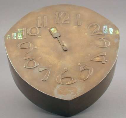 of shaped lozenge outline, embossed with stylised Arabic numerials and inlaid with abalone panels, the shaped hands similarly inlaid (minute hand lacking)