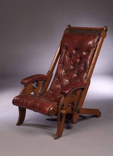 the turned top above a leaf and berry frieze and chamfered uplifts, supporting a slung button upholstered leather back and seat, above curved arms pierced with trefoils and adjustable for rake, continuing to curved front legs, the seat support with incised spiral termals continuing to form shaped supports to the rear linked by a chamfered stretcher