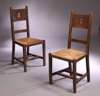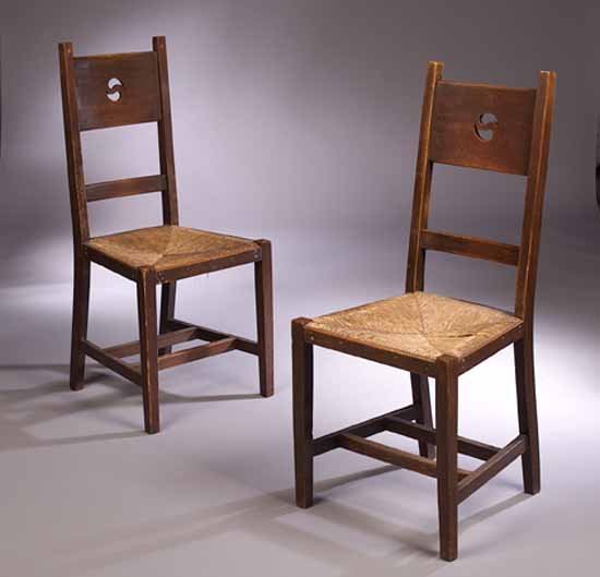the broad top rails with yin yang piercings raised above drop-in seats on square legs linked by stretchers (2)
