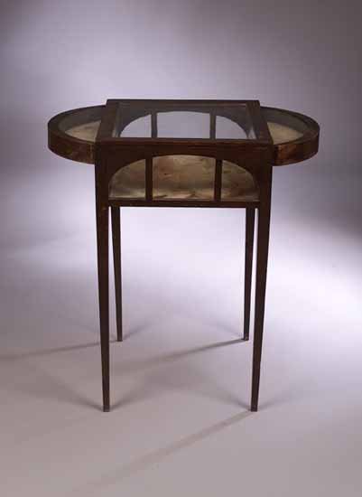 circa 1901, the square glazed hinged top flanked by sliding demilune glazed boxes for display, supported by peg, the sides with arched glazed panels, the base velvet lined, the whole raised on square section tapering legs