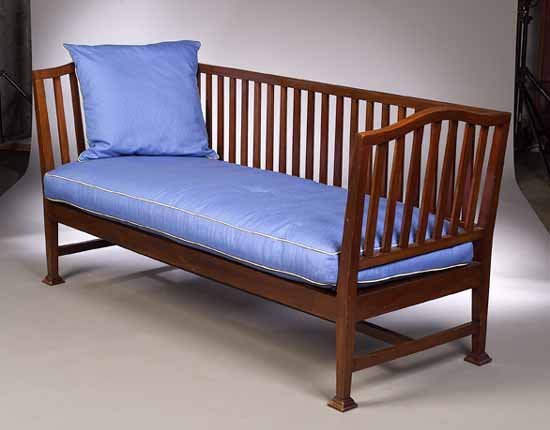designed by E.A. Taylor (1874-1951) for Wylie and Lochhead, Glasgow, the slatted rectangular back with serpentine slatted arms, above a square cushioned seat raised on square tapering legs, with moulded block feet