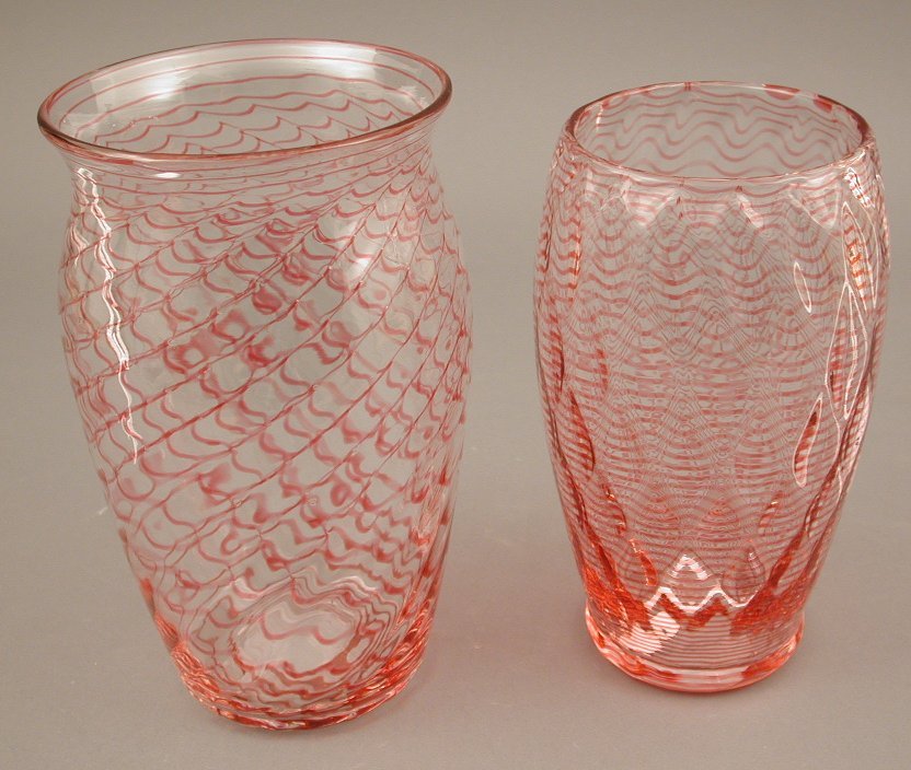 the dimpled body with waved cross hatch design in pink, 22.5cm and and another vase with pink horizontal rib decoration
