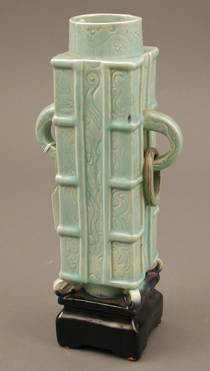 in the Chinese taste, the square section body moulded with lattice work and stylised plant form, with twin ring handles to the sides, glazed in turquoise, raised on a stepped base glazed in navy, impressed mark 'Dunmore'