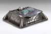 with hammered finish, the shaped hinged lid inset with turquoise cabochon and with applied decorative strapwork above tapered sides with rivet decoration