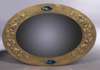 of oval outline, repousse decorated into sprays of roses and set into two oval Ruskin cabochon,