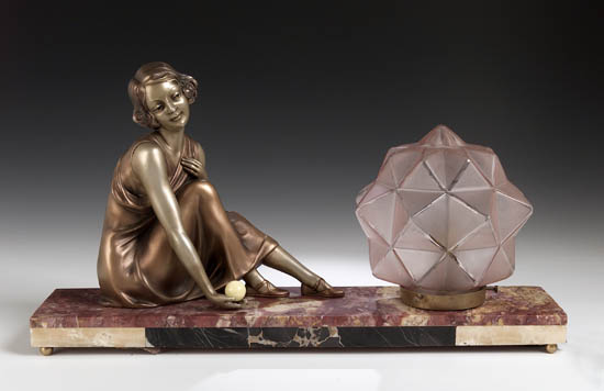 cast as the figure of a seated girl holding an ivorine ball with adjacent light fitting with pink glass shade, the whole raised on marble and onyx base with gilt sphere feet