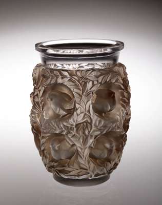 of swollen cylindrical form, moulded with birds and leaves, etched mark "R. Lalique France"