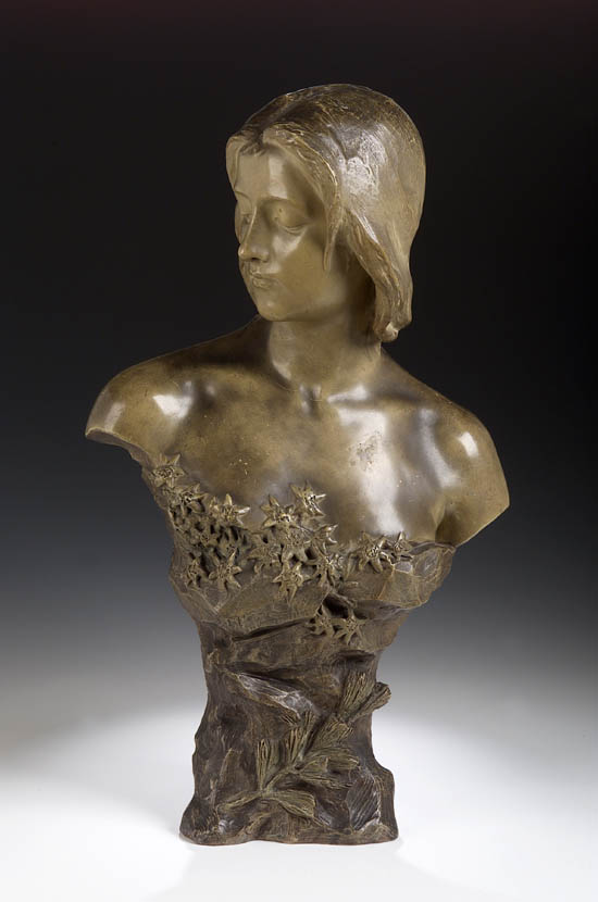of the head and shoulder of a girl, garlanded with flowers and raised on a rocky naturalistic base, moulded marks embossed 2090/ 125/32