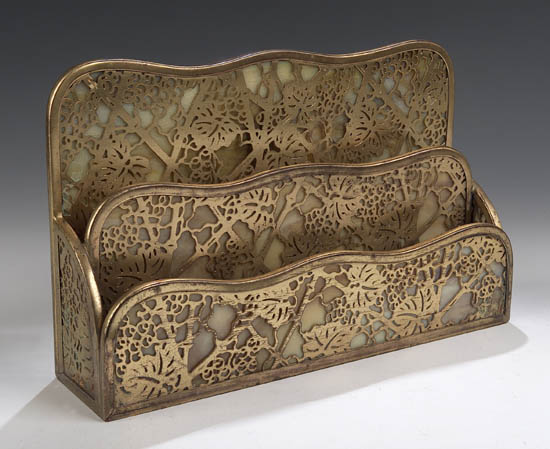 the three shaped dividers in pierced gilt metal enclosing opaque glass panels, stamped marks Tiffany Studios, New York 1008