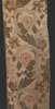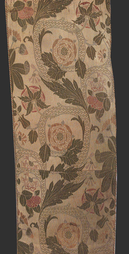 woven with coloured threads in a repeating pattern of flowering rose branches on a puckered unbleached ground, 206cm x 78cm, also a further piece of the same fabric