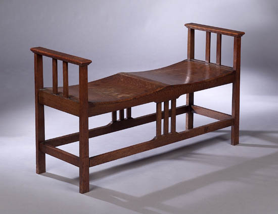 the twin dished solid seat enclosed by slatted open arms on square section supports linked by stretchers