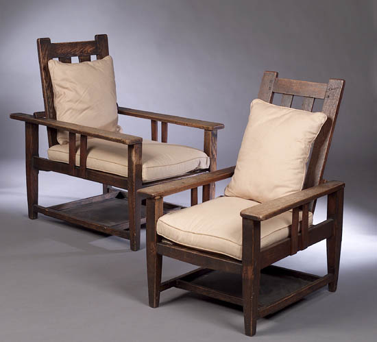 in the manner of Gustav Stickley, each with the slatted and adjustable rectangular back above broad open arms raised above a cushioned seat on square tapering legs linked by an undertier