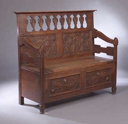 the rectangular back with moulded top above a pierced gallery carved with seedheads and twin panels of flowering foliage, the open arms above solid hinged seat above two carved panels of whiplash foliage on shaped feet