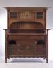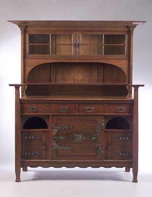 the broad projecting and moulded cornice above twin astragal glazed doors and open shelf, the lower section with rectangular tip above two drawers and a central door below, flanked by two smaller doors, each fitted with decorative copper hinges, the whole with square tapered supports to the front angles
