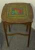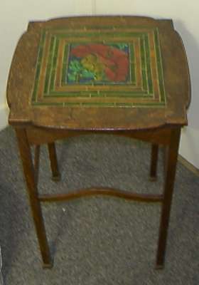 the shaped square top inset with tiled panel, centred with a square tile with poppy motif, raised on square section legs with serpentine stretchers and block feet
