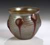 of ovoid form with everted rim, the lemon glass body covered with pulled bands of paler blue iridescence and decorated with applied prunts pulled down to the base and covered with a streaked bronze iridescence