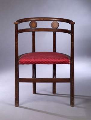 the double curved top rail with lozenge inlaid disc dividers and turned spindles above upholstered panel seat, raised on turned and tapering supports with finial terminals linked by stretchers